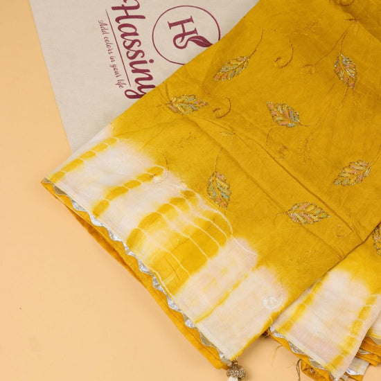 - Design: Traditional Rajasthani Bandhani (Bandhej) tie-and-dye with gold buti motifs
