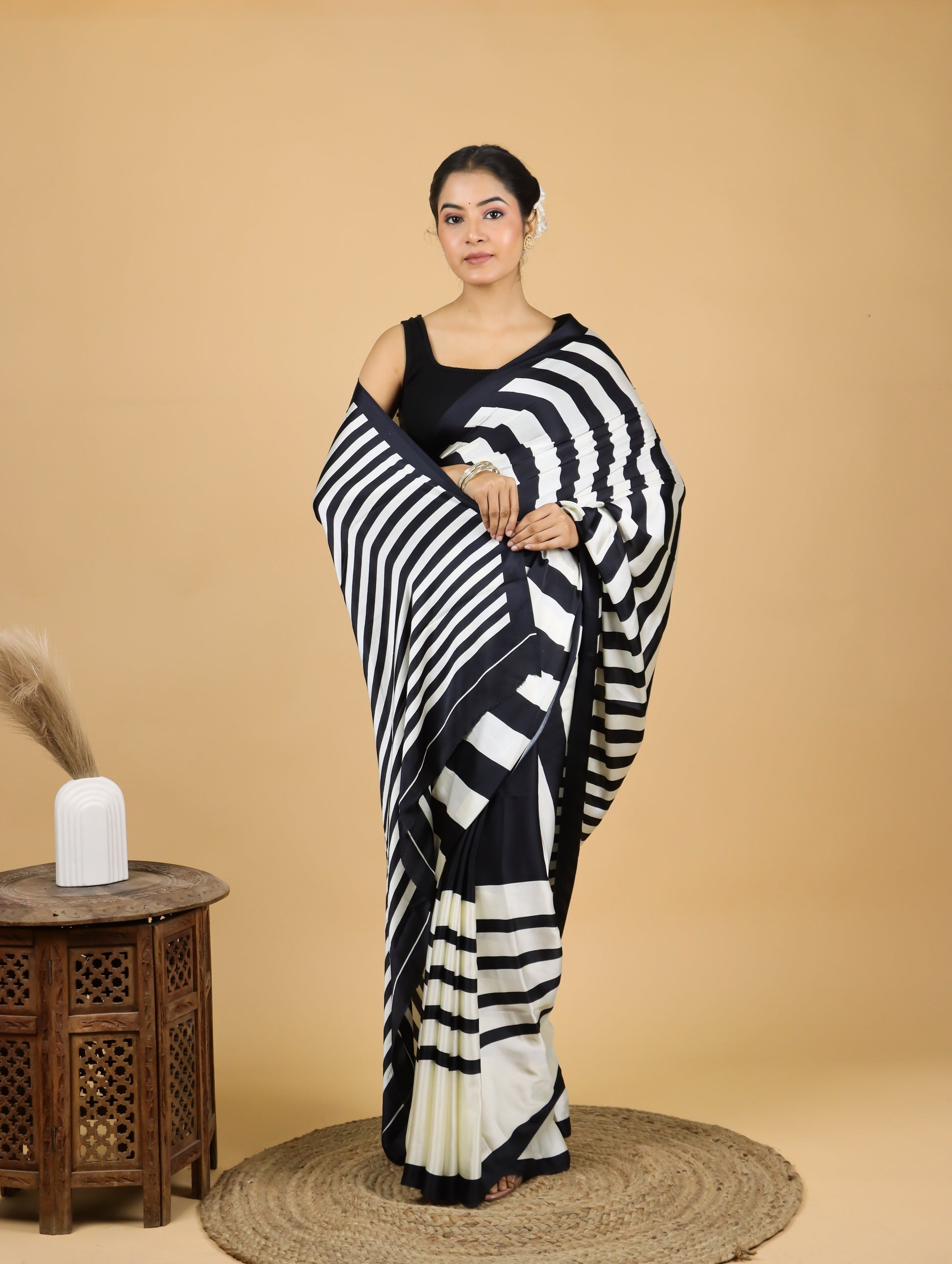 Make an unforgettable statement with this Monochrome Luxe Striped Satin Saree, crafted for women who adore bold, modern elegance. The smooth satin fabric glides effortlessly with a lustrous finish, while the striking black-and-white stripes create a contemporary, high-fashion aesthetic.