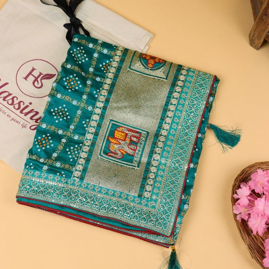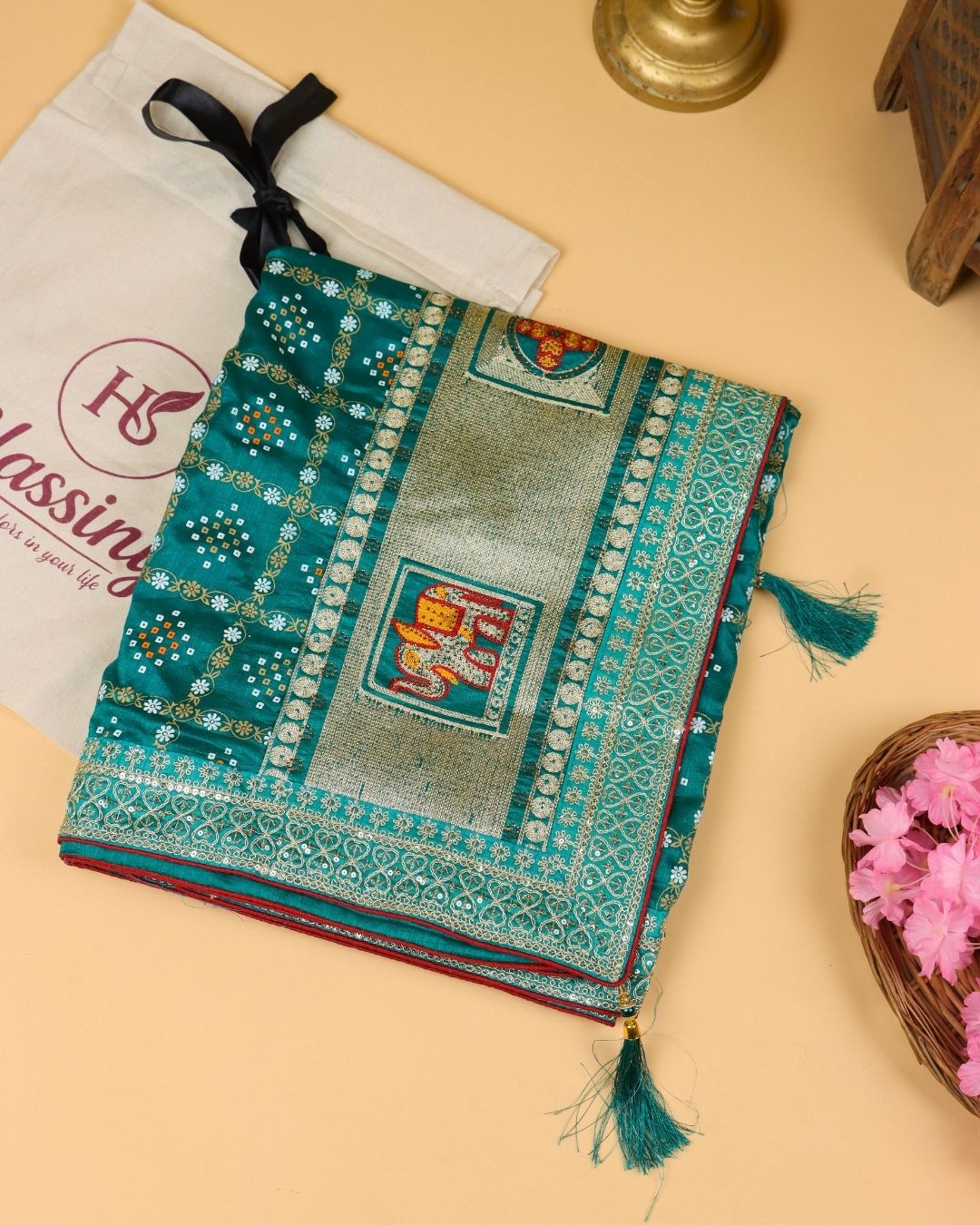 Step into timeless elegance with the Blended Silk Bandhani Saree, a masterpiece that celebrates the artistry of traditional craftsmanship and modern grace. Draped in a rich hue, this saree showcases exquisite Bandhani tie-dye patterns, meticulously handcrafted to perfection. The intricate silver zari border and pallu add a regal touch, enhancing its festive and luxurious appeal.