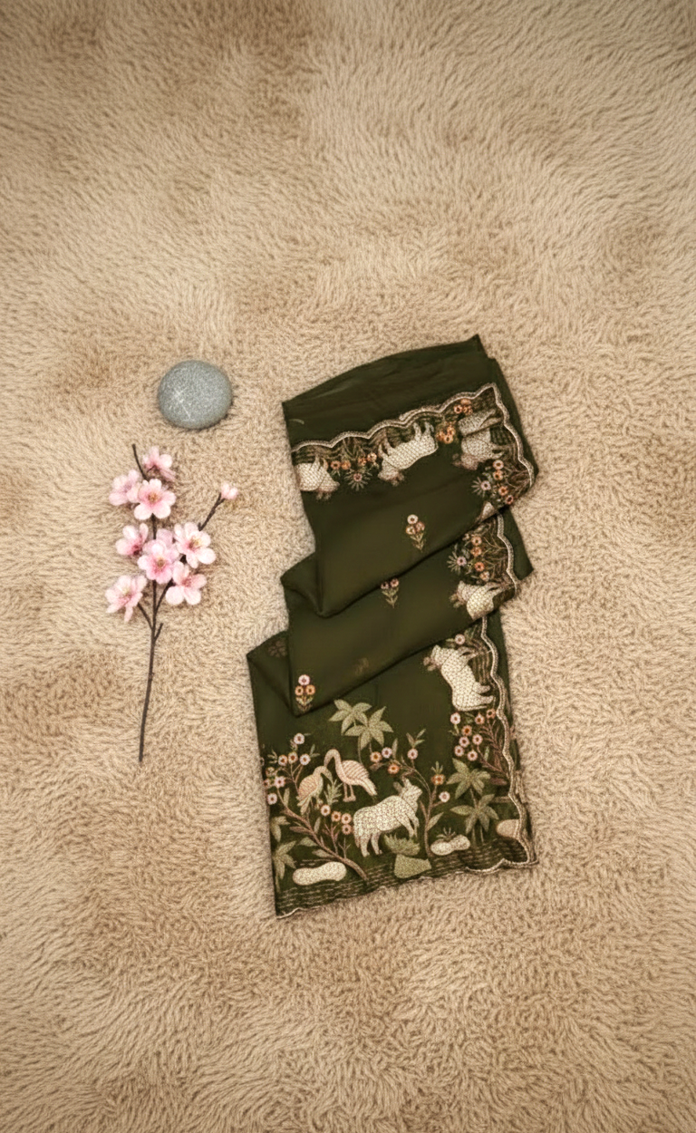 Embrace earthy sophistication with the Cotton Silk Saree, a perfect blend of tradition and tranquility. Draped in a rich tone, this saree captures the calm beauty of nature through its exquisitely embroidered pastel motifs of elephants, birds, and floral vines. The intricate border showcases detailed craftsmanship that tells a story of elegance rooted in culture.
