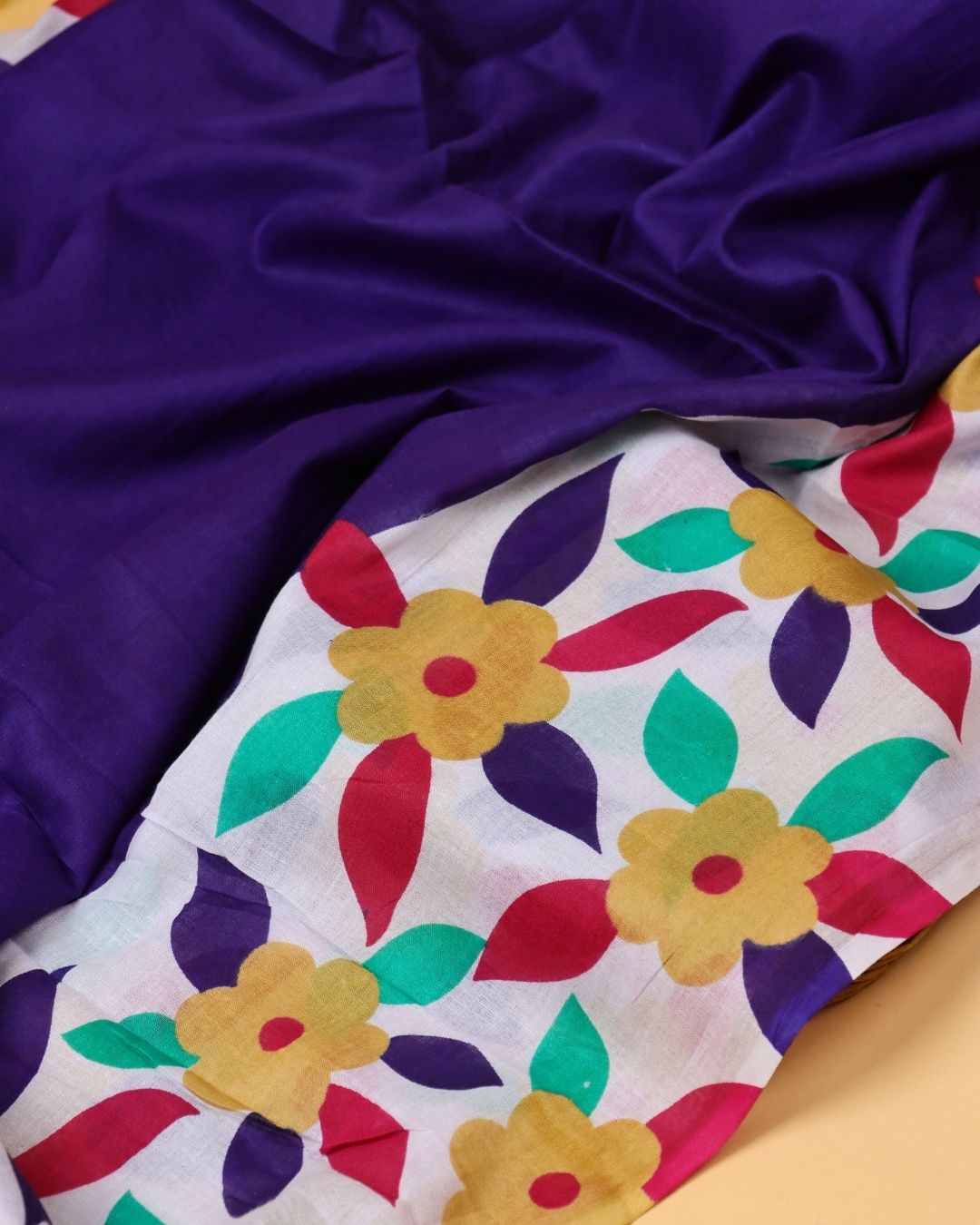 A perfect harmony of bold elegance and cheerful charm, the Hassiny Deep Navy Blue Mul Cotton Saree is crafted to brighten every occasion. The deep navy-blue drape beautifully contrasts with the vibrant floral border in hues of yellow, red, and green symbolizing joy and confidence in every thread.