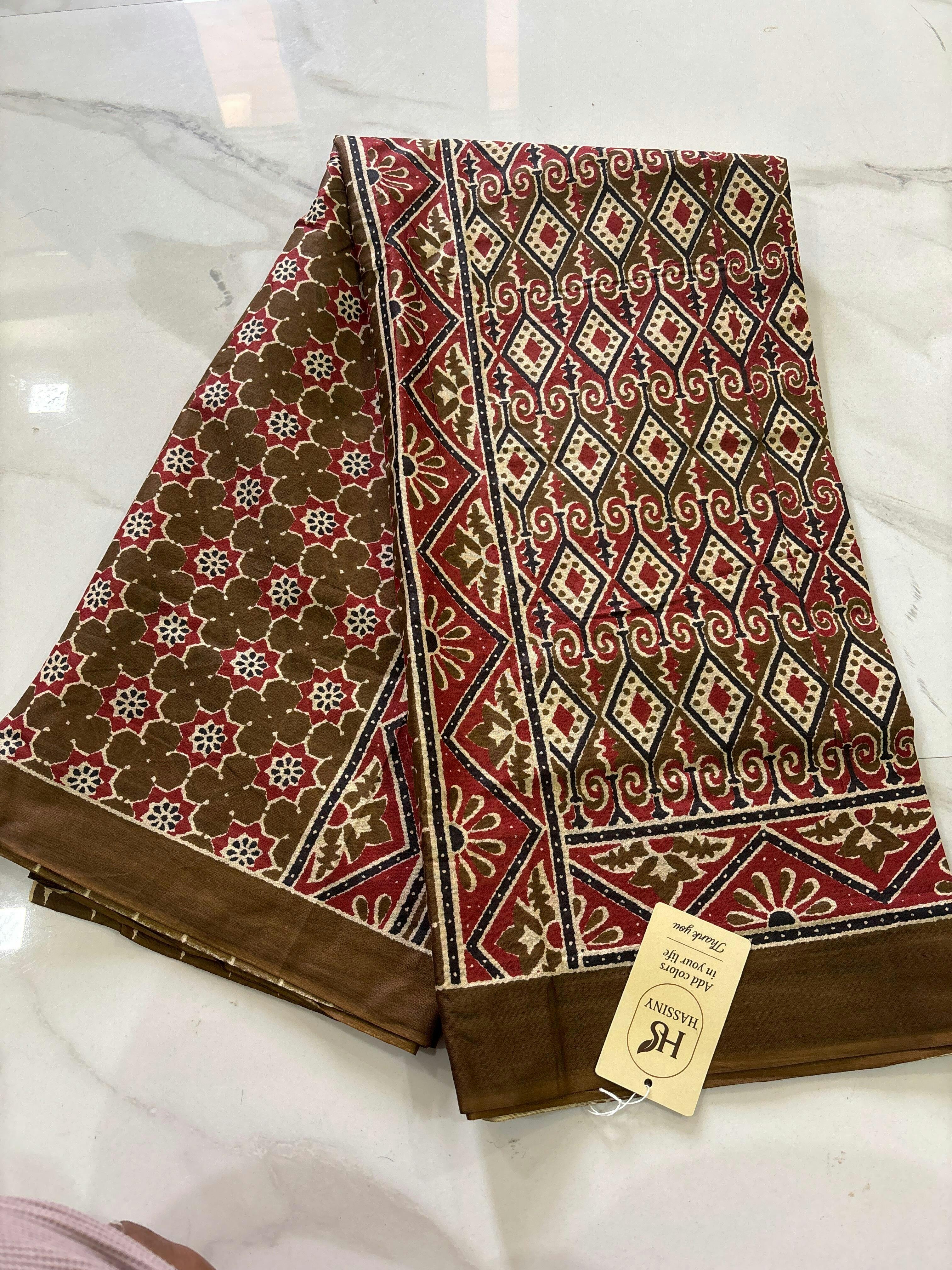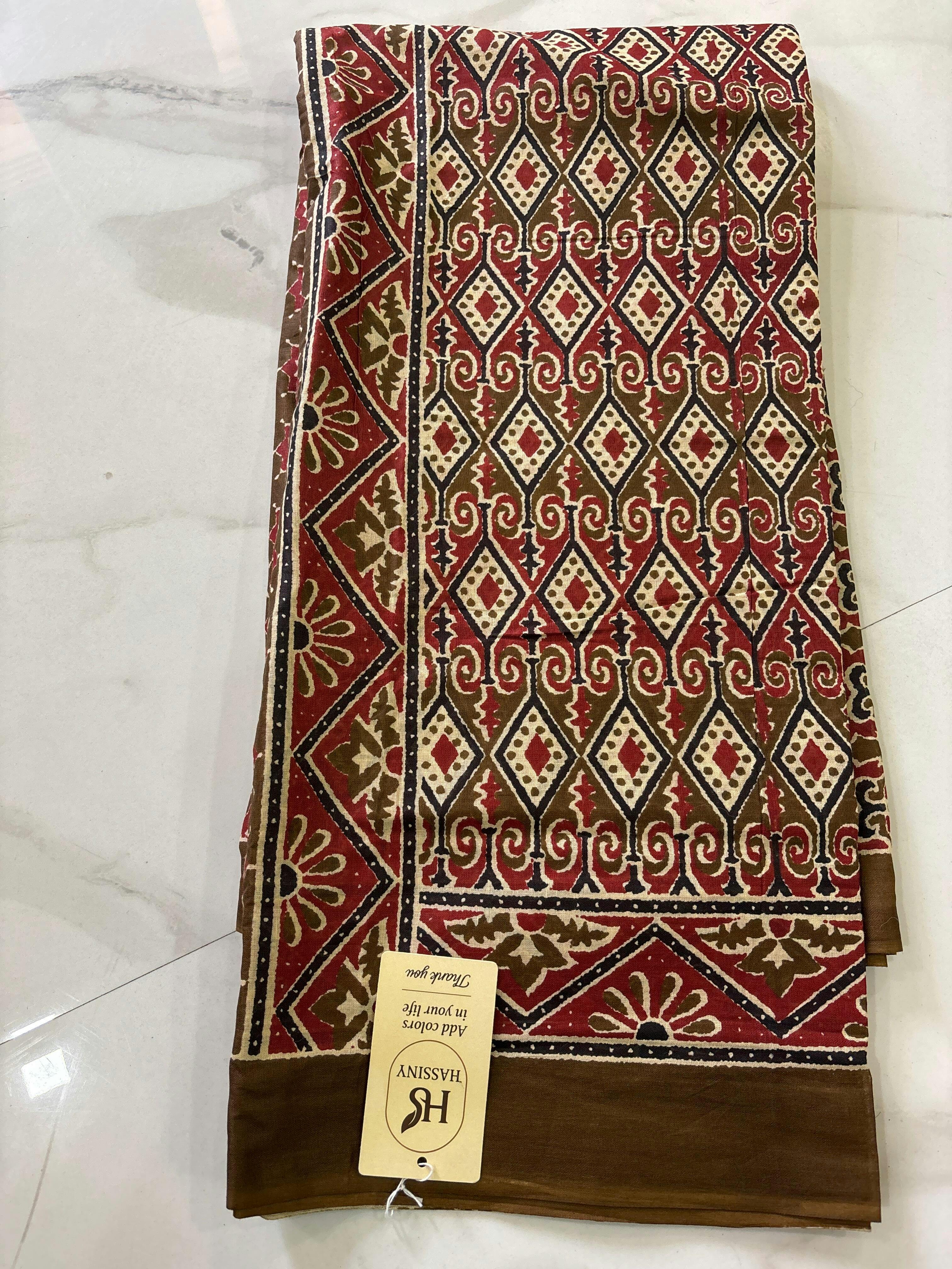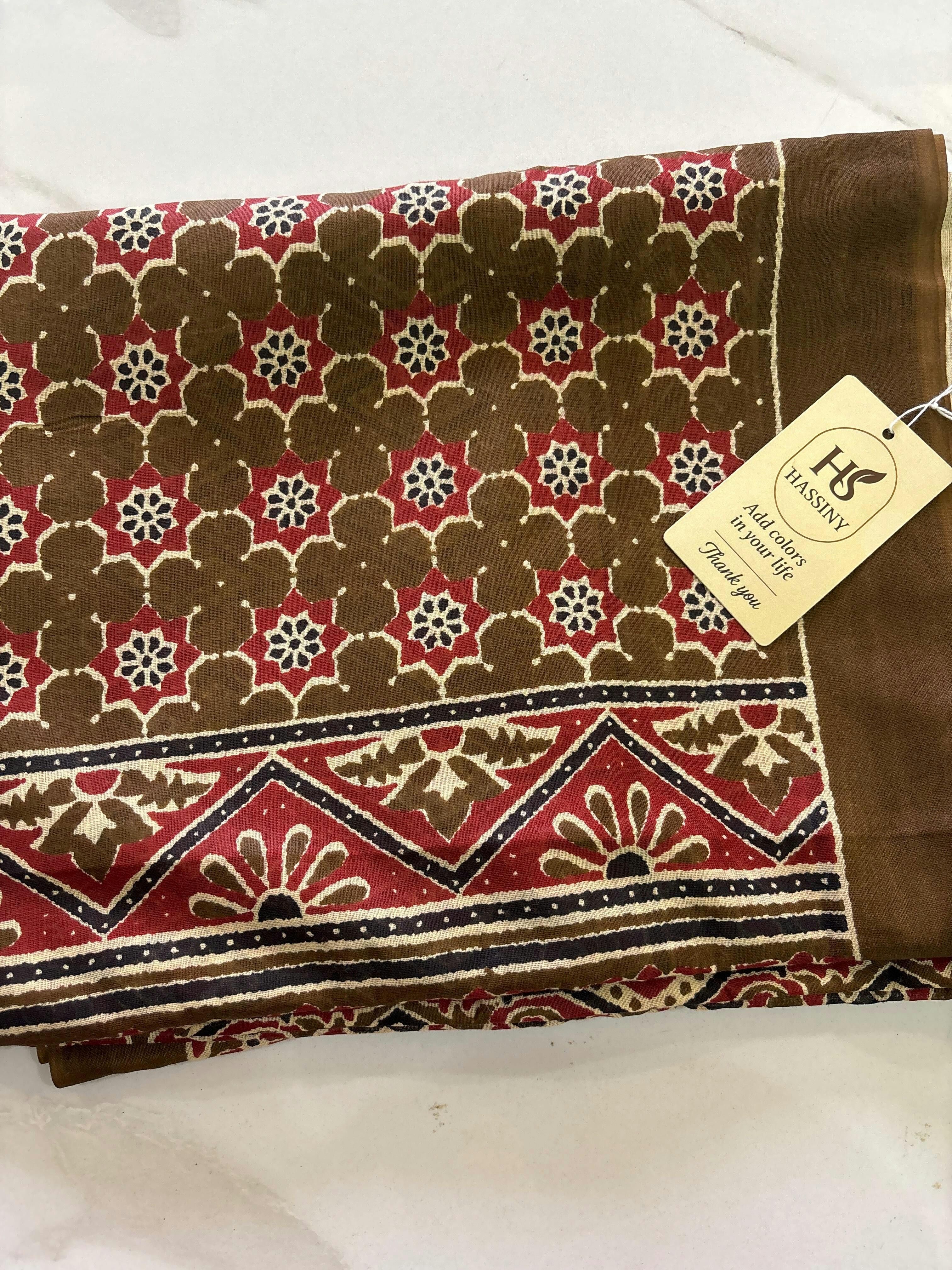 Traditional charm meets contemporary grace in the Hassiny Earth Weave Mul Cotton Saree. Adorned with intricate geometric and floral motifs, this saree features a captivating blend of olive brown, maroon, mustard, and beige tones, creating a rich tapestry of earthy elegance. The detailed diamond pattern across the body and the ornate border add depth and artistry to its overall appeal.